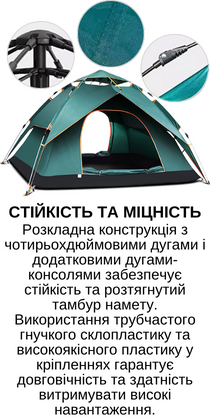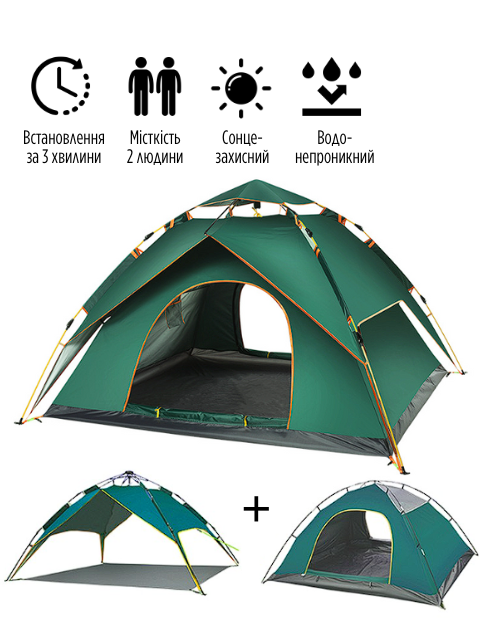 Туристична автоматична палатка-намет, ідеальна для використання як укриття від сонця чи для ночівлі під час туристичних пригод, риболовлі, полювання та природного відпочинку у теплу пору року.
