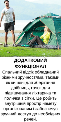 Автоматична палатка-намет вражає своєю простотою експлуатації, дозволяючи навіть туристу-початківцеві легко встановити і зібрати намет всього за кілька хвилин.